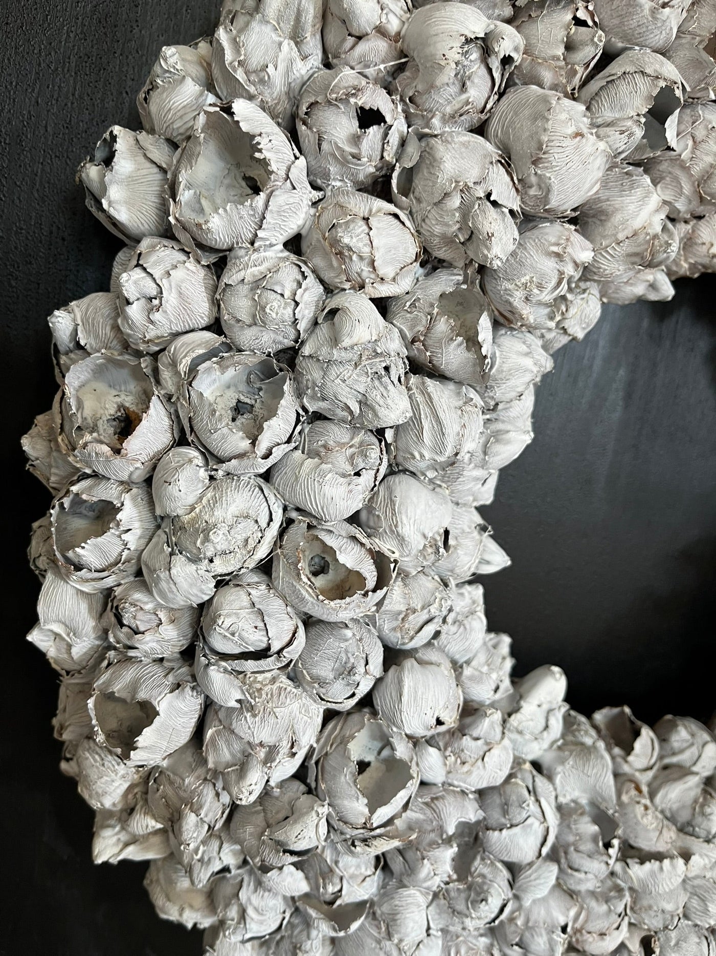 Dieser handgefertigte Kranz aus echter Cocofrucht begeistert mit seiner natürlichen Struktur und dem eleganten Weißton. Ob an der Wand, auf einem Tablett oder als Tischdeko – der Kranz bringt Leichtigkeit und einen Hauch Exotik in jedes Zuhause. Jeder Kranz ist ein Unikat mit individueller Maserung.